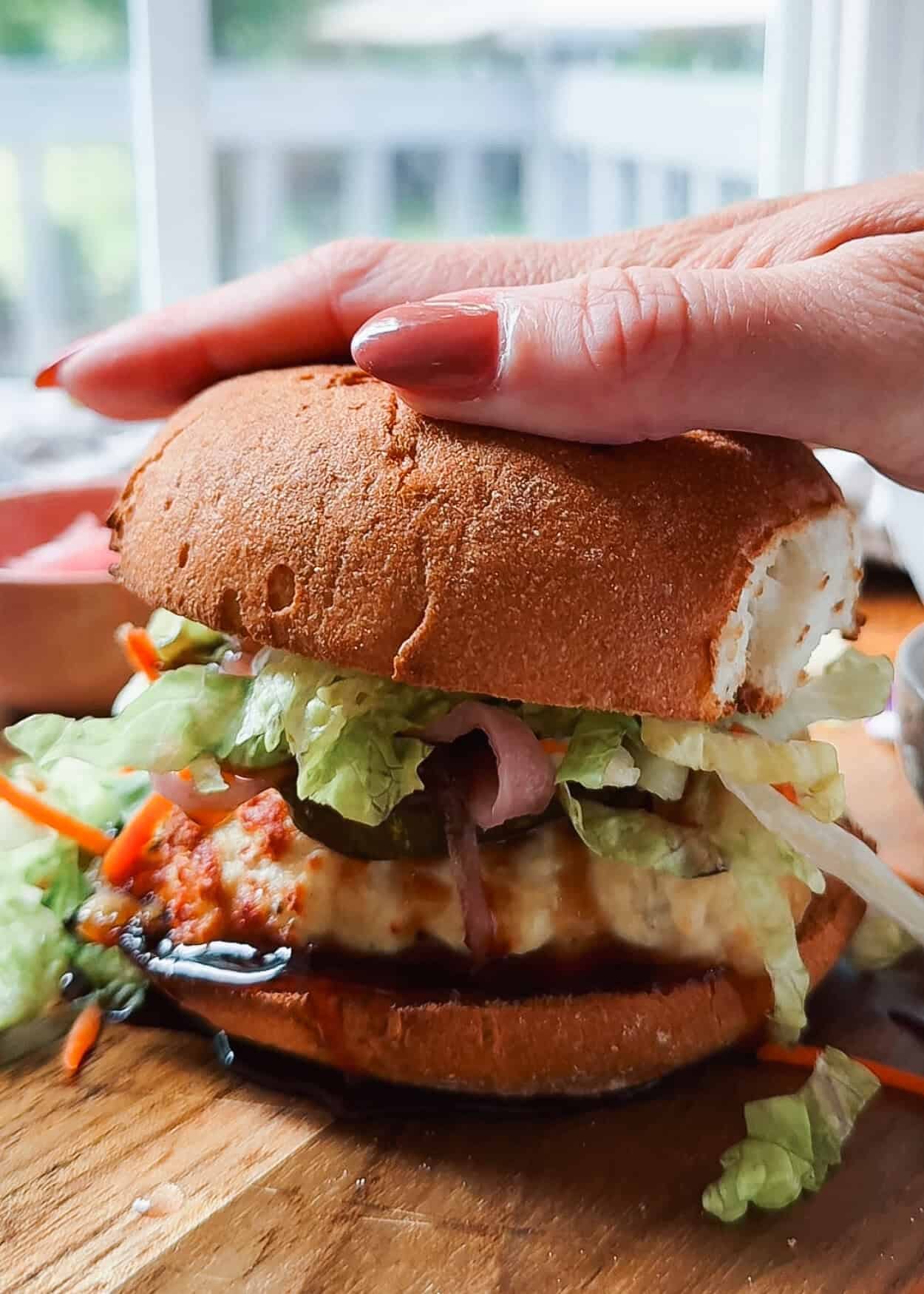 After going gluten free, some days I just miss being able to order a burger or a chicken sandwich at a bar. They always have such good bar toppings and I love sandwiches and finger food out at a restaurant. The only way to get this type of burger was to make it at home! I mastered this gluten free spicy chicken burger at home by making the chicken burgers from scratch in the air fryer!