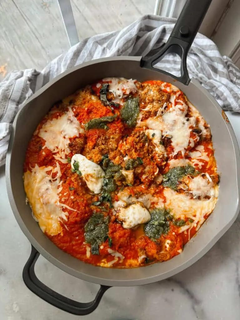 This one pan gluten free chicken and eggplant parmesan is perfect for busy nights when you don’t have a lot of time to make dinner. It is packed with layers of air fried chicken cutlets, tomato sauce, crispy eggplant slices, and mozzarella.