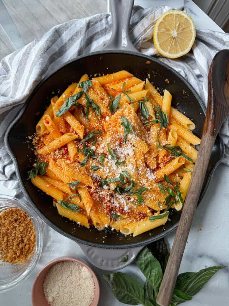 This Pasta With Romesco Sauce recipe has gluten free pasta cooked al dente and tossed with a flavorful, rich, bold romesco sauce! It is topped with gluten free breadcrumbs, lemon, parmesan cheese and basil. This dinner is the ultimate gluten free pasta recipe! It is flavorful and easy to make in under 30-minutes. This recipe is an easy gluten free dinner with a dairy free option.