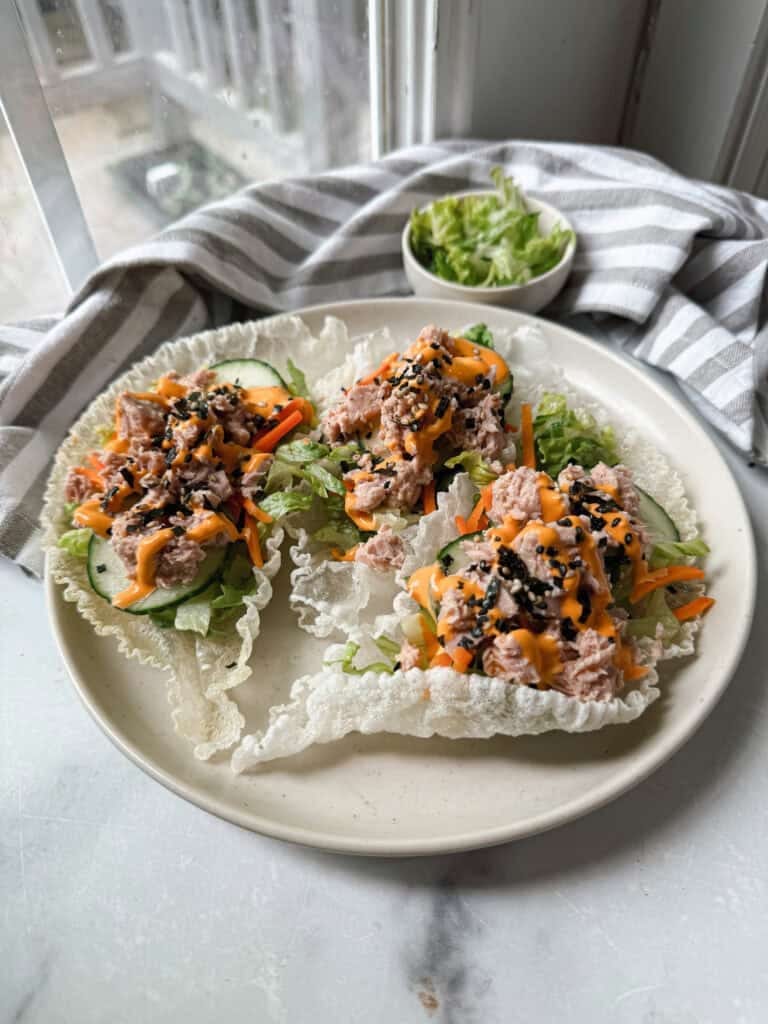 Get the Recipe > SPICY TUNA RICE PAPER TACOS (GLUTEN FREE)