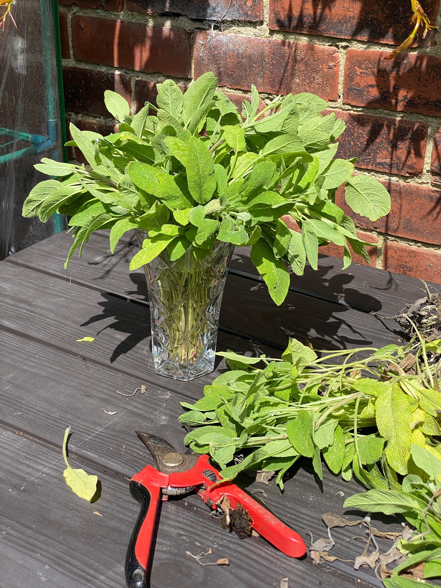 Cutting back overgrowing herb bushes such as Sage and Rosemary - after they have flowered helps make them manageable. I then place them in water or hang them to dry to keep or use in cooking.