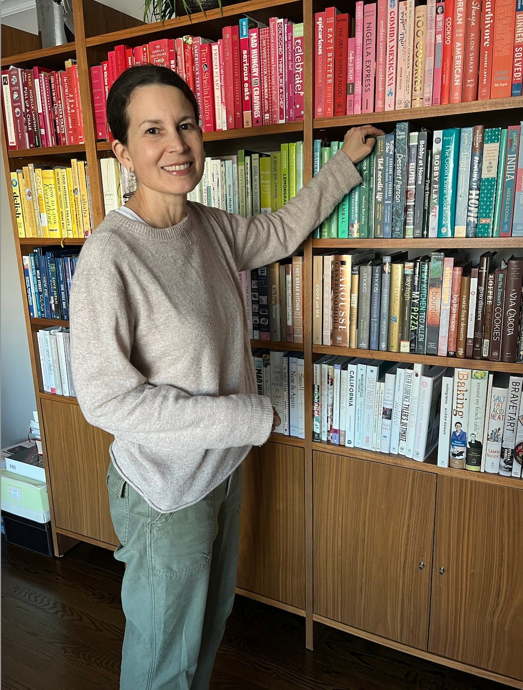 A- My cookbook collection, which I’ve been building since high school, now totals 522 books. While the number often surprises people, each one marks a step in my evolution as a cook and an important chapter of my culinary journey. Flipping through the pages of a cookbook from my past always transports me to the exact time and place when I relied on it most. The connection between food and memory runs deep and continues to inspire me. It’s something I’d love to explore further in a future post.