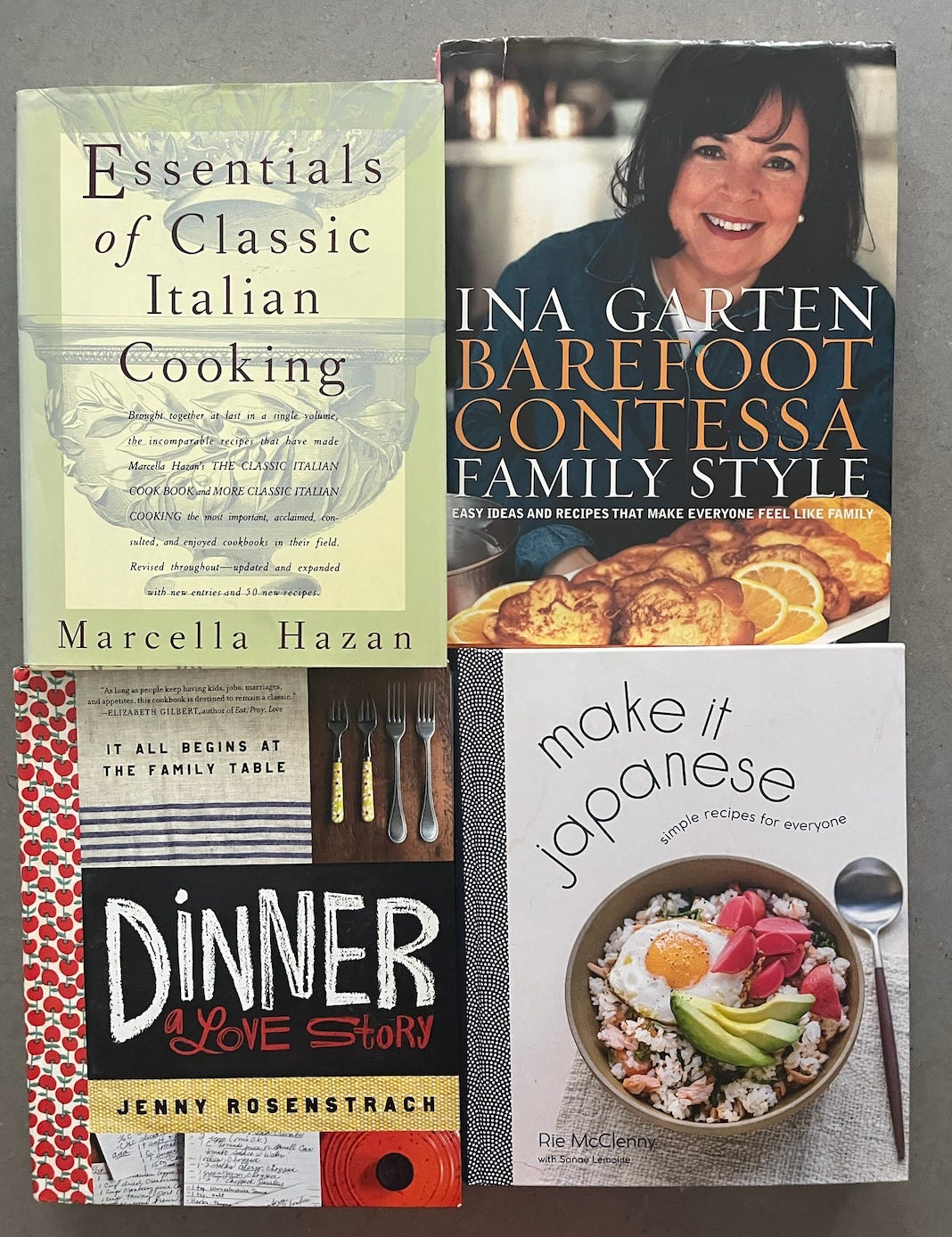 A - I love all my cookbooks, but I’ve had favorites during different stages of my culinary journey. When I was single in NYC, it was Ina Garten’s Barefoot Contessa cookbooks. Her recipes, like Coconut Cupcakes and Turkey Sausage Lasagna, were not only delicious but also helped win over my then-boyfriend, now-husband. As a mom with small kids in the city, I turned to cookbooks with quick, simple, and kid-friendly recipes, like Dinner A Love Story by Jenny Rosenstrach, Smitten Kitchen Cookbook by Deb Perelman, and Small Victories by Julia Turshen. Now, as a suburbanite with teenage boys, I’m experimenting more and cooking healthier, turning to cookbooks like Make It Japanese by Rie McClenny, Dinner: Changing the Game by Melissa Clark, and the Weekday Vegetarians cookbooks by Jenny Rosenstrach (her Roasted Vegetable Reuben is special!). And then there are the timeless classics that have always been there for me—Essentials of Classic Italian Cooking by Marcella Hazan (go for the Tomato Sauce with Onion and Butter, stay for the Walnut Cake) and The Essential New York Times Cookbook.