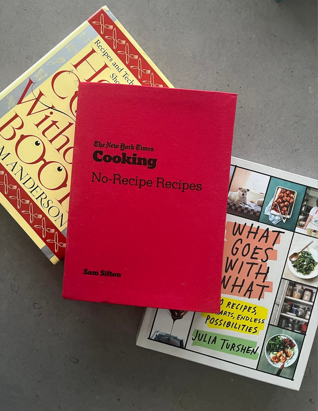 Lastly, I would probably suggest a book focused on intuitive cooking, like How to Cook Without a Book by Pam Anderson, No-Recipe Recipes by Sam Sifton, or the recent What Goes With What by Julia Turshen. These books teach the fundamental building blocks of recipes, while encouraging personalization to suit your taste.