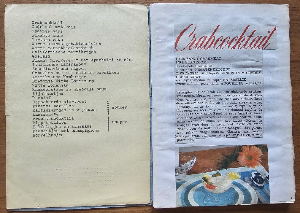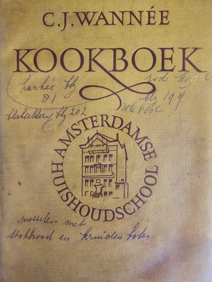 A - My oldest cookbook was a gift from my grandmother, she bought it in 1962 when she was 44, and I got it when she was 84. It’s the WANNEE kookboek, Amsterdamse huishoudschool ( WANNEE cookbook, Amsterdam housekeeping school). I have the 14th print, published between 1950 and 1960. The first edition is from 1910. I remember my grannie cooking from it on Sundays. She didn’t like cooking but seen from today’s perspective, she made lovely pure home-made cooking. Till today, I am so glad with this book, mostly because there’s a lot of her handwriting in it. When she got older her beliefs about how-to-behave changed, making notes on the cover was normal to her then. To me that’s a turning of a phase in her life, it makes the book more special.