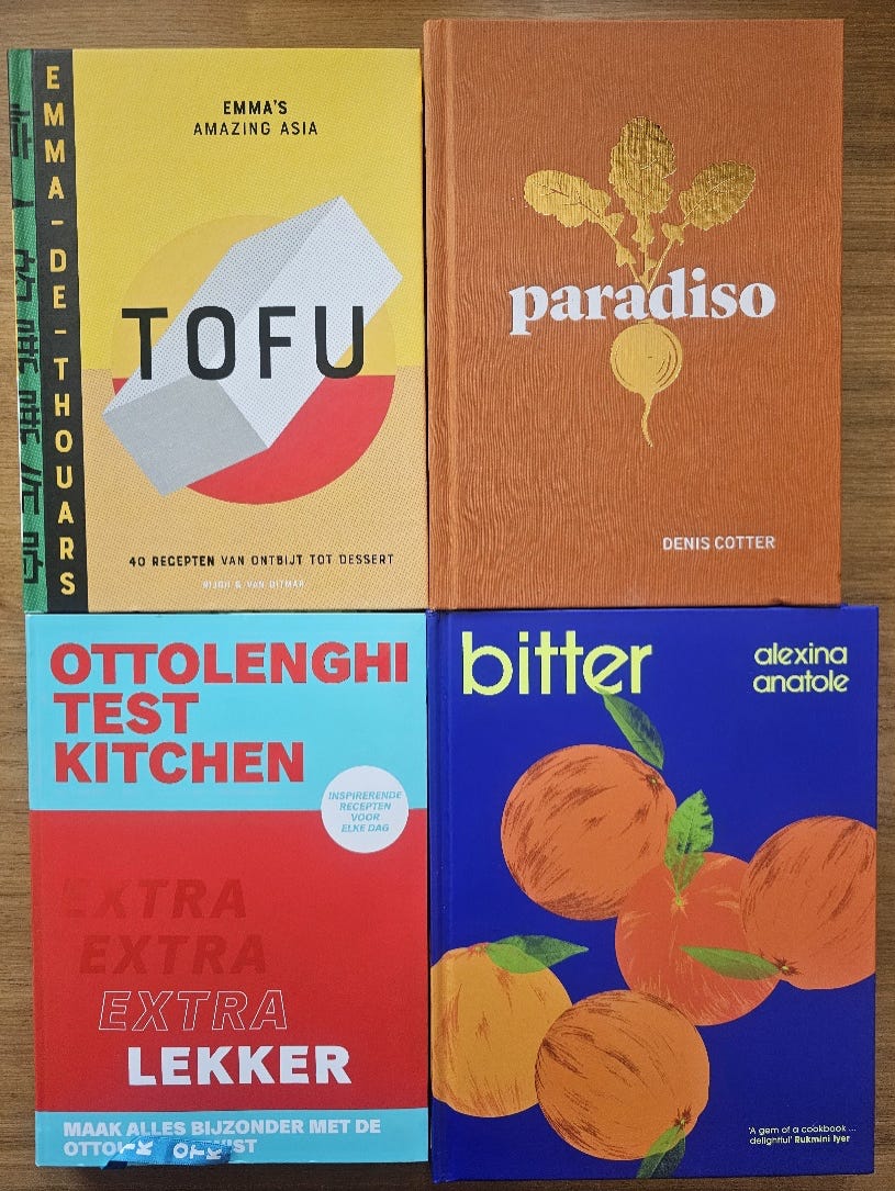 Over the years, I got more interested in cookbooks and in cookbooks with a certain theme. Like books on 1 certain lifestyle (Solo, Emma de Thouars) or books on 1 ingredient, like Jackfruit, or halloumi cheese (the Halloumi cookbook, Heather Thomas) or Tahin (The magic of Tahini, Dunja Gulin). Or books on liquids; like wine, beer, Verjuice and vinegar , eg. (the Vinegar cupboard, Angela Clutton). The more specialized the book, the more I like it, that’s to say, if there is also a fresh design in it. At the moment my collection counts 346 cookbooks, the most of it are (like new) second hand cookbooks.