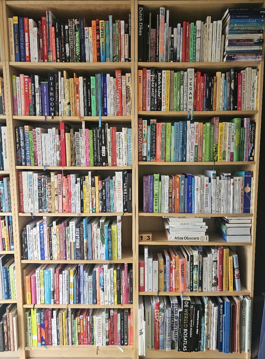 During Covid it was a nice distraction to be busy with my bookshelves. First I arranged them in alphabetical order by title. Later by color (it was really nicely looking but couldn’t find anything anymore). Nowadays it’s a mixture of methods, which works the best for me. The first shelves are filled with books arranged by country or continent. The rest of the shelves are filled with books arranged by theme (in alphabetical order): flavours (e.g. sour, bitter, sweet), liquids in alphabetical order (like coca cola, coffee, hot sauces, margaritas, Sriracha cookbook, tea), vegetables (jackfruit, cauliflower, eggplant, greens), vegetarian and vegan.