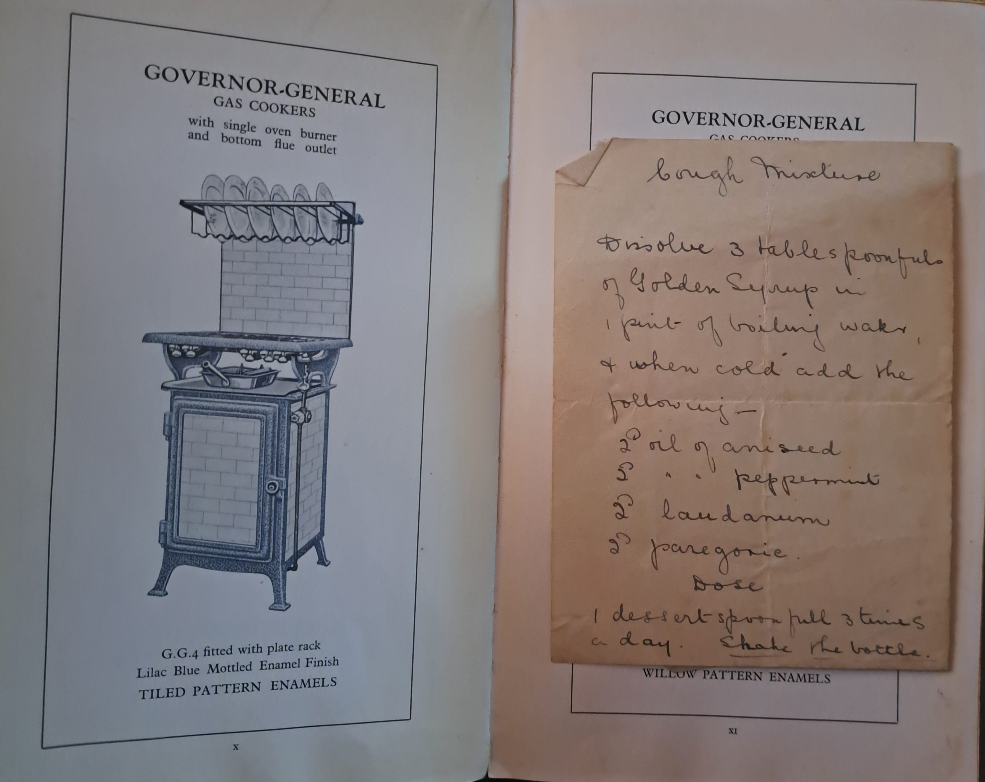 A - Curye on Inglysch, the very first cookbook published in the UK in the 14th century. I have it from when I made a television documentary about whelks because, yes there’s a medieval recipe using whelks which we recreated. The copy I have was republished by Prospect books. I have a few books from the 1920s and ‘30’s including this one; I especially love it for all the hand written recipes tucked inside. Note that the ingredients in this cough mixture include laudanum, and don’t you just love the stove?