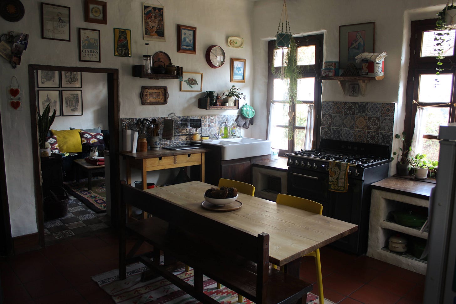 A: When we bought the house, it had no kitchen or bathroom. There was only a sink in the corner of the room, behind a curtained-off area that functioned as a wash space. It took us a while to get around to building a kitchen – we had some major jobs to do first, including the bathroom, central heating, replacing all the windows, and getting the house rewired. For months, our 'kitchen' comprised a sink, a plank of wood balanced across two chairs, and a table left by the previous owners.