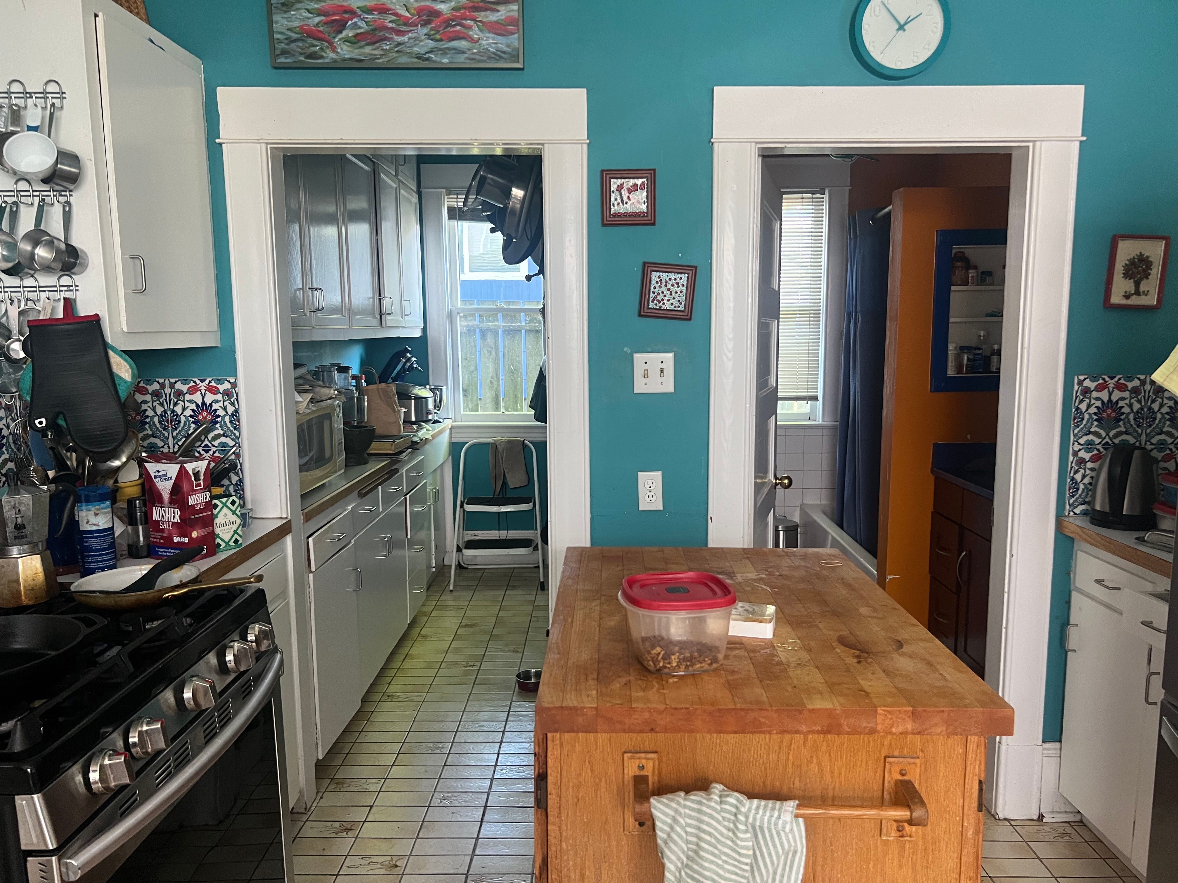 We've lived in the house for almost 30 years and kept its original footprint, cabinets, and countertops — definitely not fancy, but I've managed to produce a lot of wonderful meals here. We inherited a funky old island when we bought the house, which has been a useful workspace and storage area.