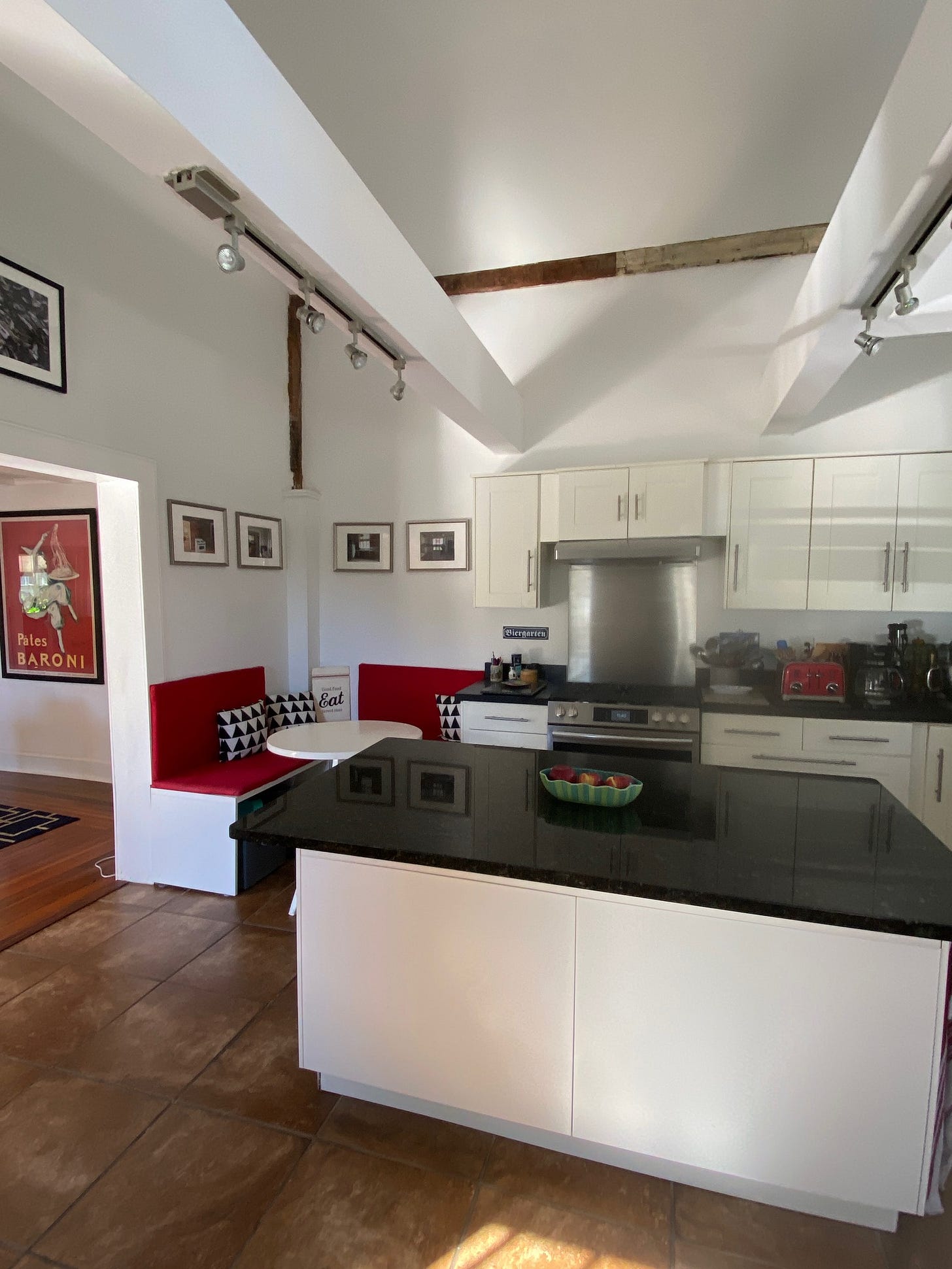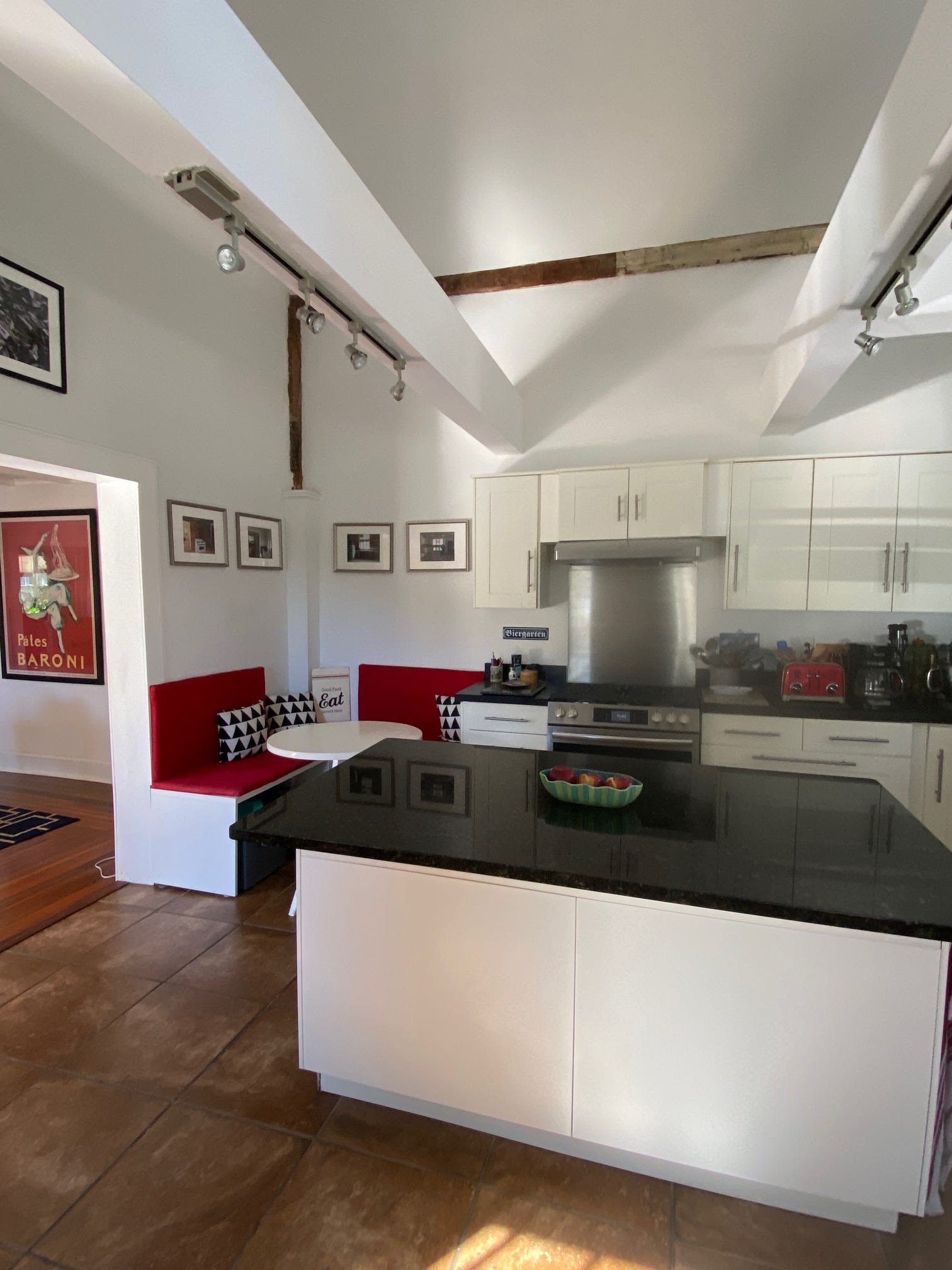 Q: Can you please describe the layout of your kitchen, how much of a role it plays with your family, and when writing your short stories on 'Something Tasty’?