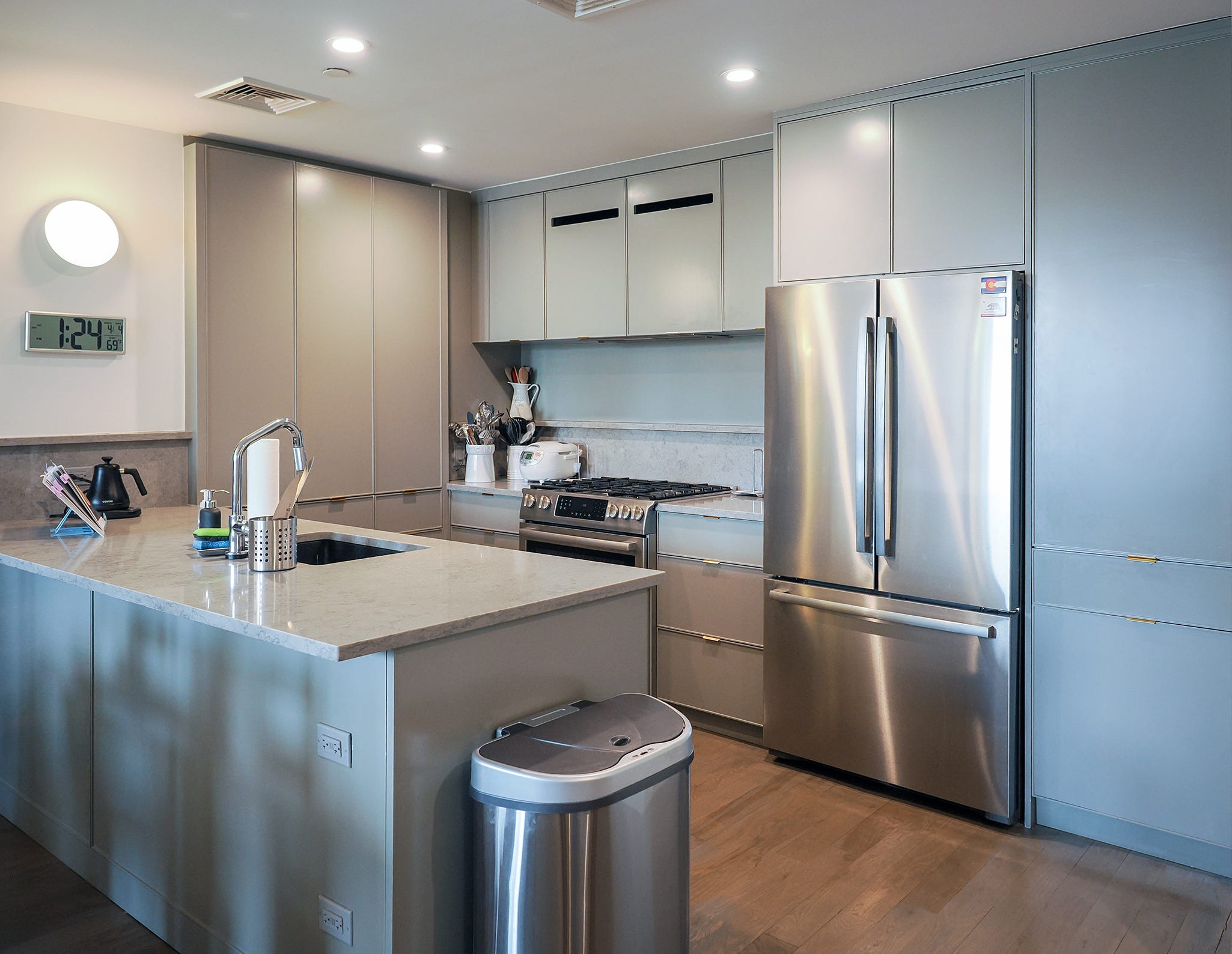 A: My kitchen is a relatively narrow galley kitchen with a wall of shallow shelves at one end that I use as pantry storage. On one side of the refrigerator, there is a deep floor-to-ceiling cabinet. The center shelf has an electrical outlet, which I think might be for something like a microwave. I use this as my appliance storage shelf.